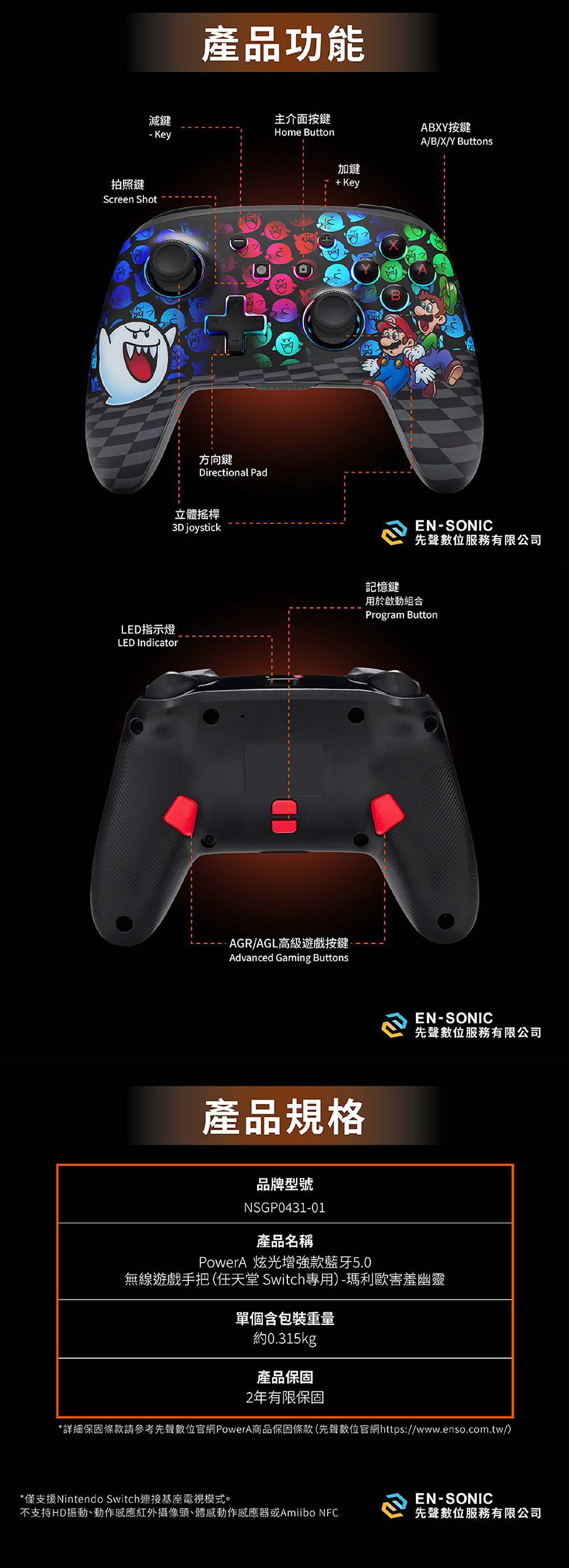 PowerA 炫光增強款 Nintendo Switch 專用無線控制器(瑪利歐 & 害羞幽靈款)